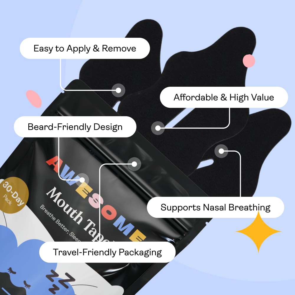 Awesome Mouth Tape™ gently trains you to breathe through your nose, helping you sleep deeper, reduce puffiness, and wake up truly refreshed — no pills, no machines, just better sleep through better breathing.