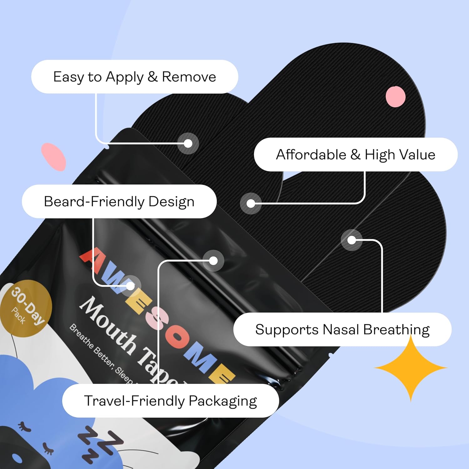 Sleeping with Awesome Mouth TapeTM leads to better breathing, quieter nights, and more energized mornings. Just deeper sleep — naturally.