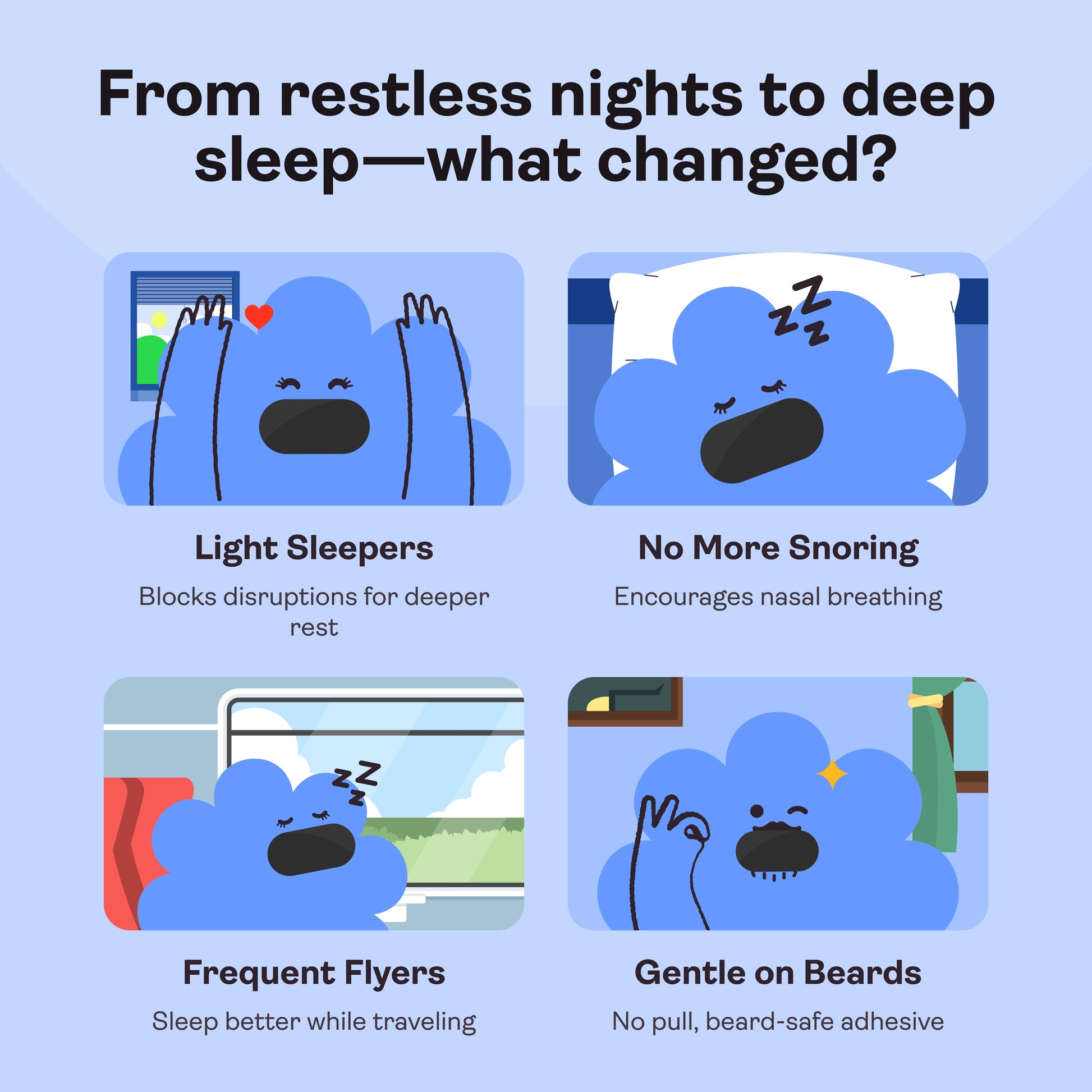 Mouth tape keeps your mouth closed, ensuring that you breathe through your nose rather than your mouth. Since mouth breathing can contribute to snoring, nasal breathing reduces throat vibrations, which means less snoring. Our mouth tape is perfect for anyone looking to reduce nighttime disturbances and sleep more soundly.