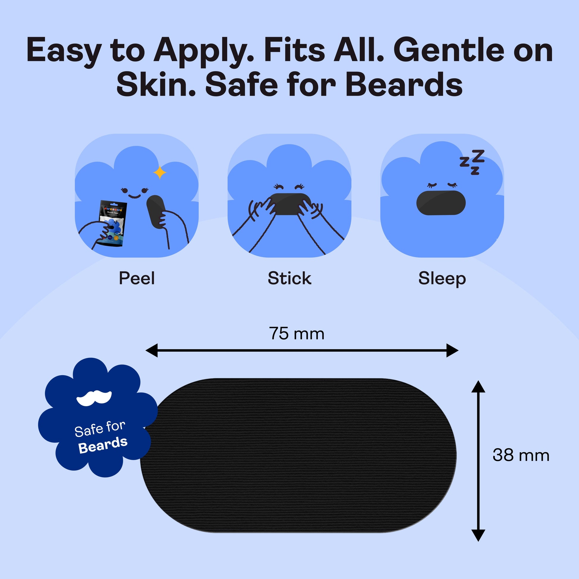 Applying mouth tape is easy! Simply clean and dry the area around your lips, then gently press the tape across your mouth. It should feel secure but not restrictive—just enough to encourage nasal breathing throughout the night. It’s quick, comfortable, and effective for a better night’s sleep.