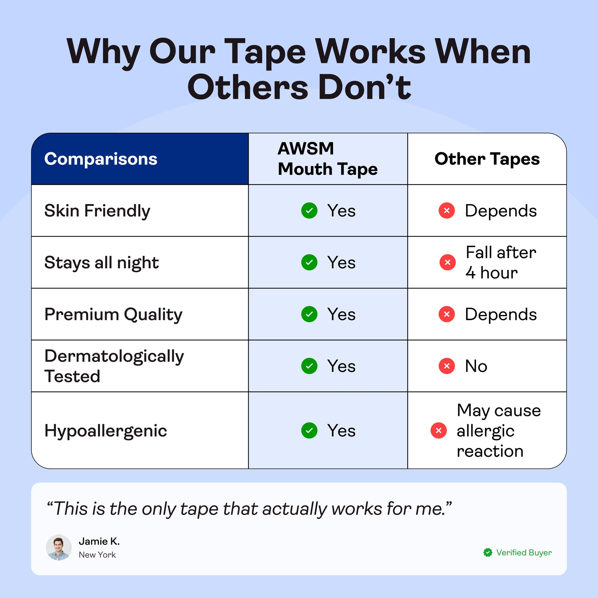 Sleeping with Awesome Mouth TapeTM is a simple shift that leads to better breathing, quieter nights, and more energized mornings. Just deeper sleep — naturally.